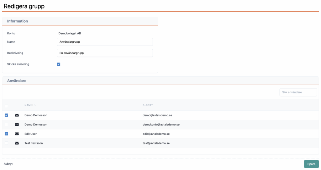 En nyhet är att det nu går att skapa användargrupper. En användargrupp kan användas för att gruppera aviseringsmottagare och avtalsansvariga. Detta gör det enklare att hantera aviseringsmottagare för ett avtal. Istället för att gå in på varje avisering och lägga till och ta bort enskilda mottagare kan du koppla en användargrupp till aviseringar och istället lägga till och ta bort användare i grupperna så uppdateras det överallt.
