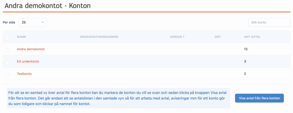 Det har dock kommit lite önskemål på att kunna se avtal från flera konton samtidigt och göra exporter så det går nu att göra. Det är endast avtalslistan som går att se, men all filtreringsfunktionalitet, sök och export till Excel finns tillgänglig som i den vanliga listan för endast ett konto.