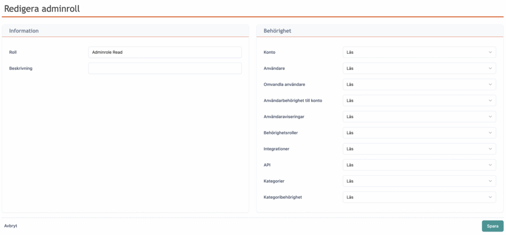 En nyhet i Avtalsbevakning är att det nu går att skapa behörighetsroller även för administrationssidorna. Tidigare kom en administratör åt alla sidor och kunde hantera både konton, användare, behörigheter och integrationer. Nu går det istället att begränsa så att en administratör kanske ska kunna skapa nya och redigera konton och användare, men inte behörigheterna och inte komma åt hanteringen av integrationer.